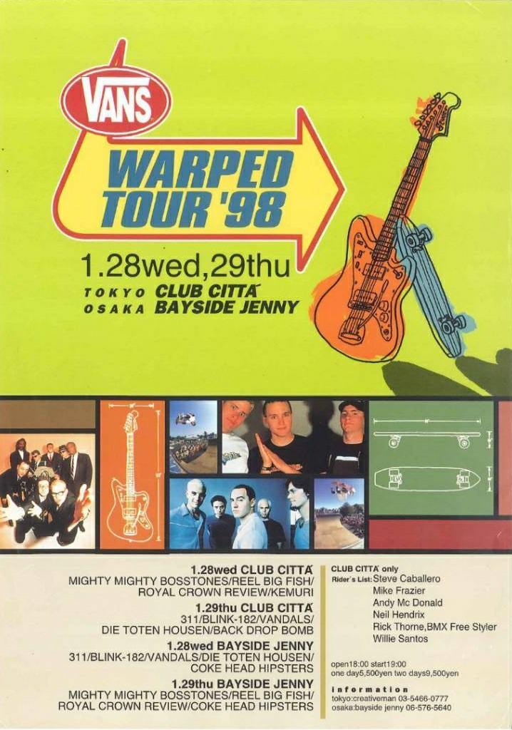 1/28 – 1/29/98 Japan Posted by311ArchiveJanuary 28, 1998August 24, 2024Posted in1998, Flyer / Handbill, Japan Shows: Warped Tour ’981/28/1998 Club Citta in Tokyo JP1/29/1998 Bayside Jenny in Osaka JP Related