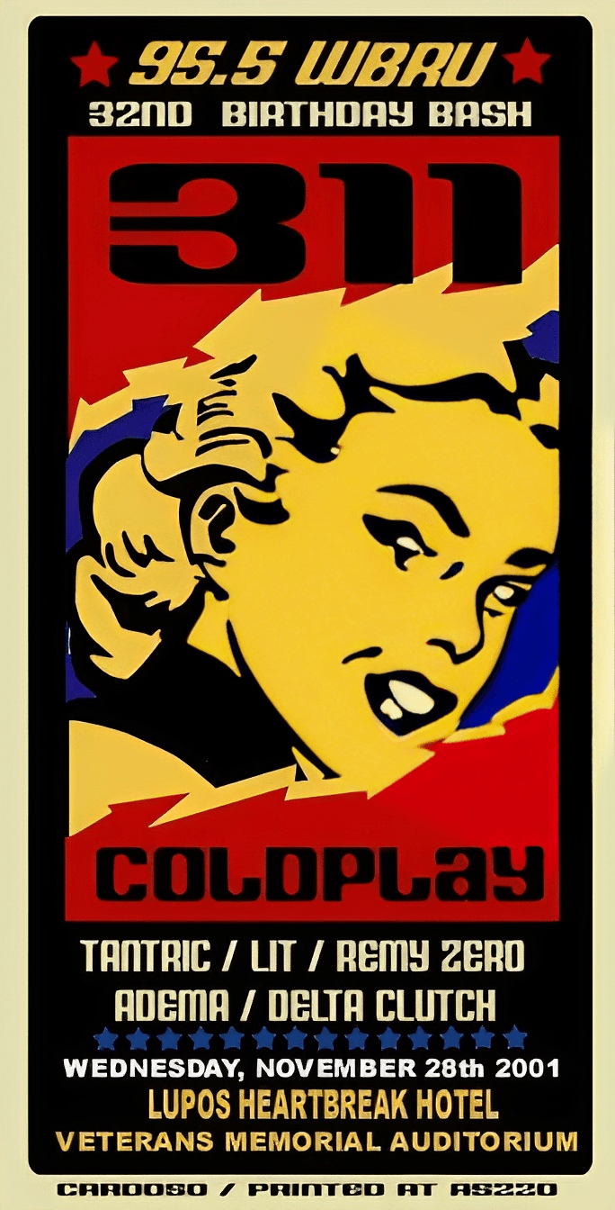 11/28/01 Providence, RI Posted by311ArchiveNovember 28, 2001August 24, 2024Posted in2001, Festivals, Flyer / Handbill, Posters, RI Artist: ?Show: 11/28/2001 95.5 WBRU’s 32nd Birthday Bash at Lupo’s Heartbreak Hotel in Providence RI Related