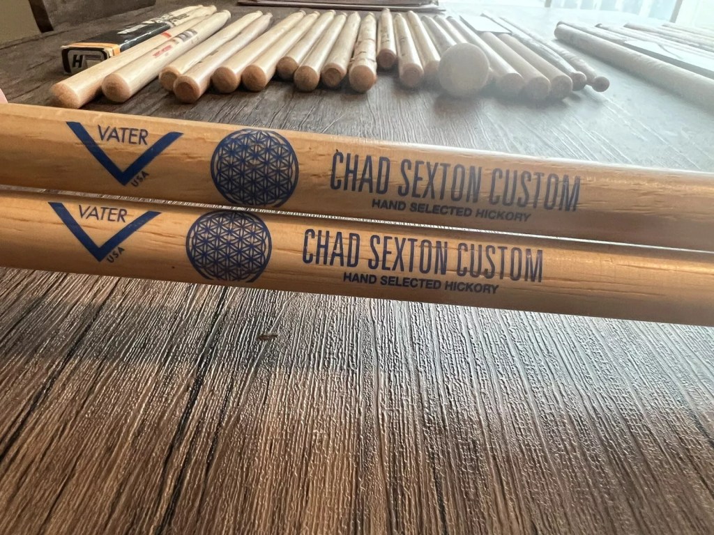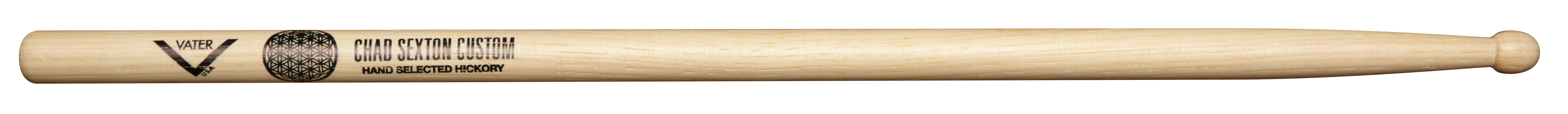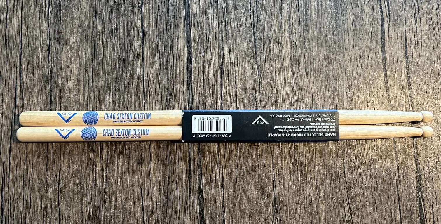 Chad Sexton’s custom model from Vater is right between a 5A and 5B in the grip. The taper and rounded barrel style tip give plenty of punch and volume. All of these elements in Chad’s Custom Model make a stick that offers durability and great speed to get around the kit quickly.