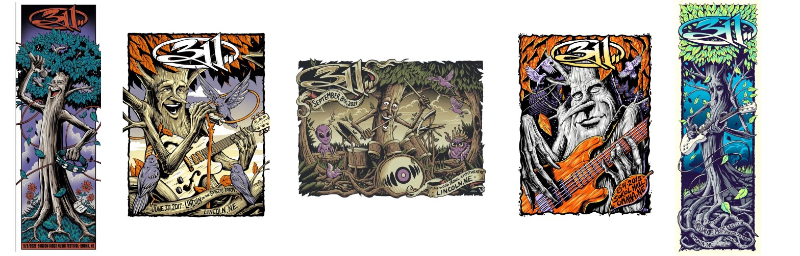 Artist Brandon Heart created a series of tree posters. Each one represented a band member and was released at a hometown show in or around Omaha, NE.