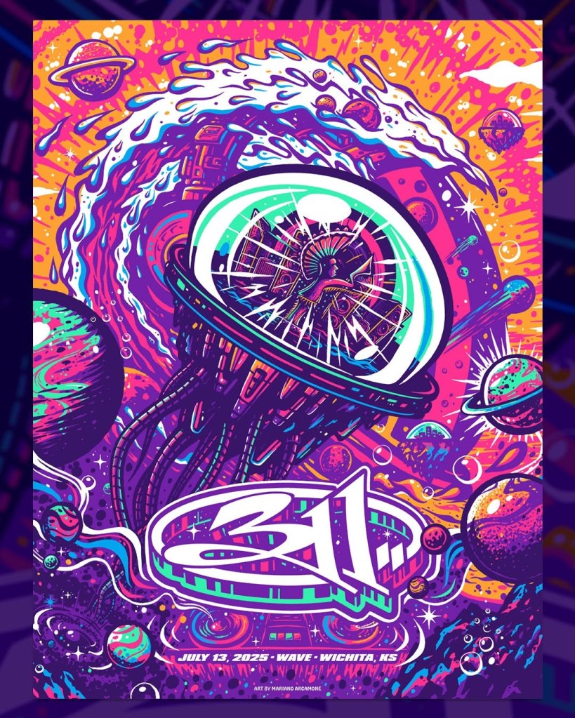 7/13/2025 Wichita, KS Posted by311ArchiveJuly 13, 2025September 22, 2025Posted in2025, KS, Posters Show: Wave ITC Artist: Mariano Arcamone Count: Regs out of 113, foils out of 45, 15 band-signed regs Related