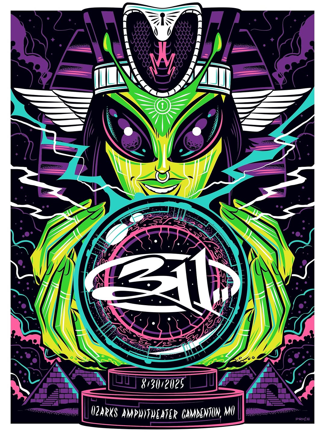 8/30/2025 Camdenton, MO Posted by311ArchiveAugust 30, 2025September 26, 2025Posted in2025, MO, Posters Show: Ozarks Amphitheater w/ Badflower and Sitting on Saturn Artist: Travis Price Count: Regs numbered out of 113, foils out of 45, and 15 band-signed regs. Related