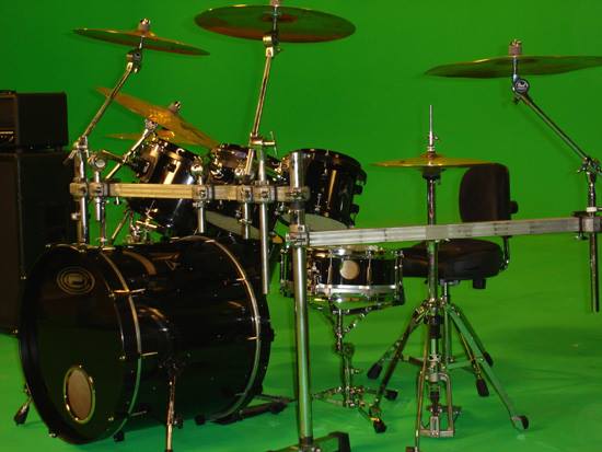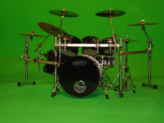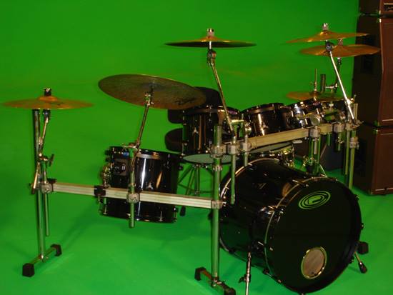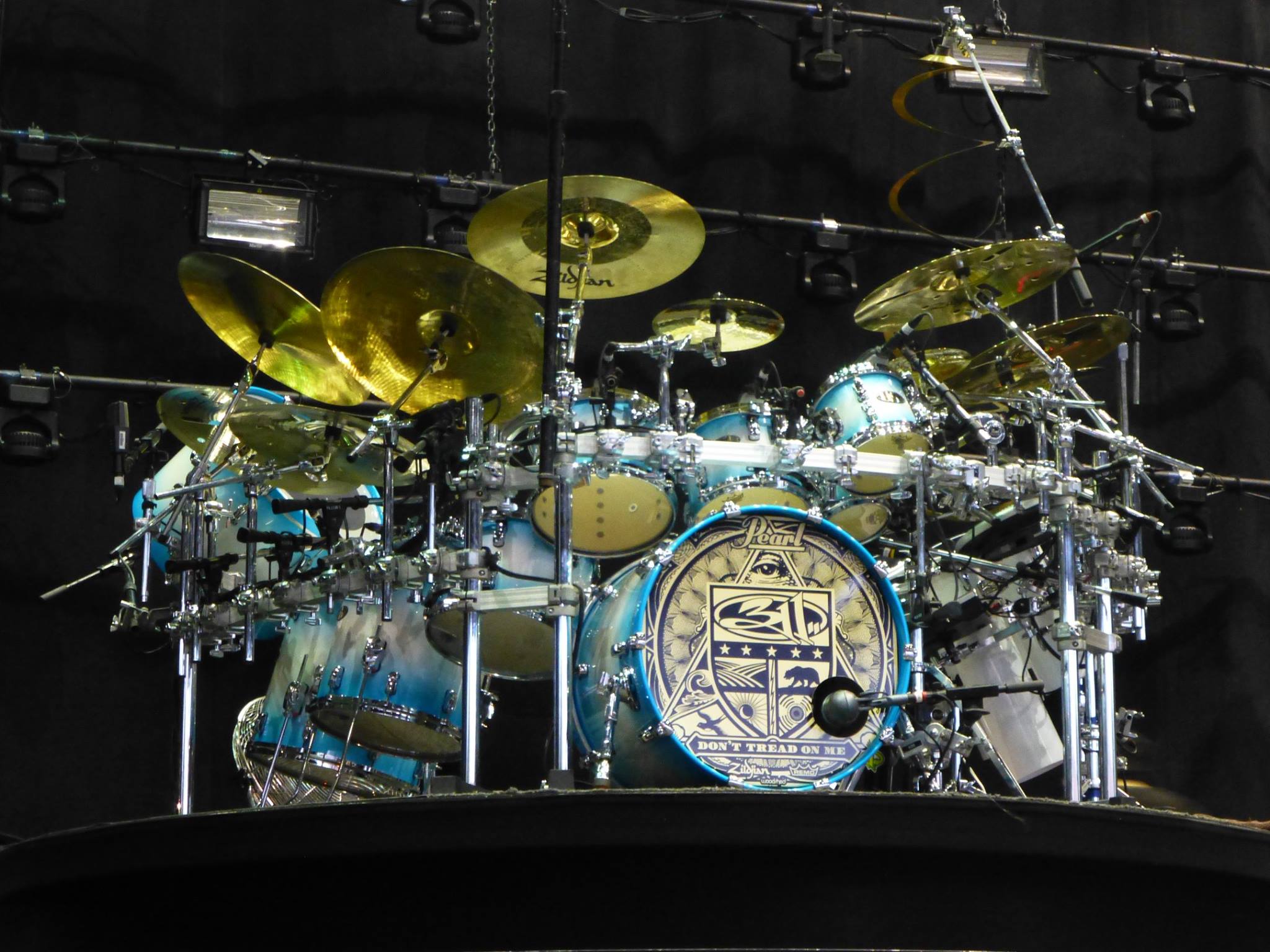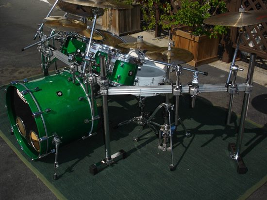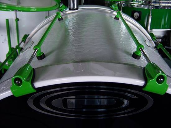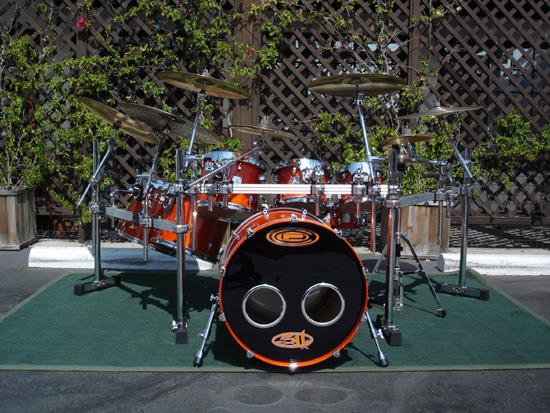 Chad said, “This kit’s custom look is sweet. All black drums and hardware with rhinestones embedded in the cover of the drums, making the effect of looking at a sky full of stars. This kit introduced my new “Energy” badge and was used in the “Flowing”, “Transistor”, “I’ll Be Here Awhile” and “Don’t Tread on Me” videos. The kit was also used on the Temples of Boom Tour and for the ‘Transistor’ album recording. The toms were used some on the ‘Evolver’ album recording and on most of the songs on the ‘Don’t Tread On Me’ album recording.”