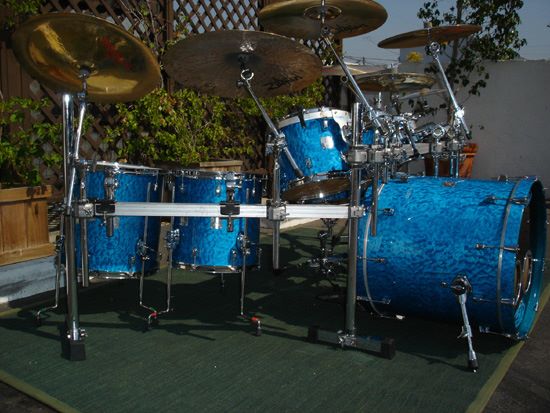 Chad said, “This kit is spectacular. Beautiful quilted maple wrapped around the drums and then stained blue. Awesome sizes and floor toms with legs! This kit was used in the “First Straw” video, and for a couple of songs on the ‘Don’t Tread On Me’ album recording. It was also my kit for the Evolver Tour and on the Don’t Tread On Me Tour before getting my clear drum set.”