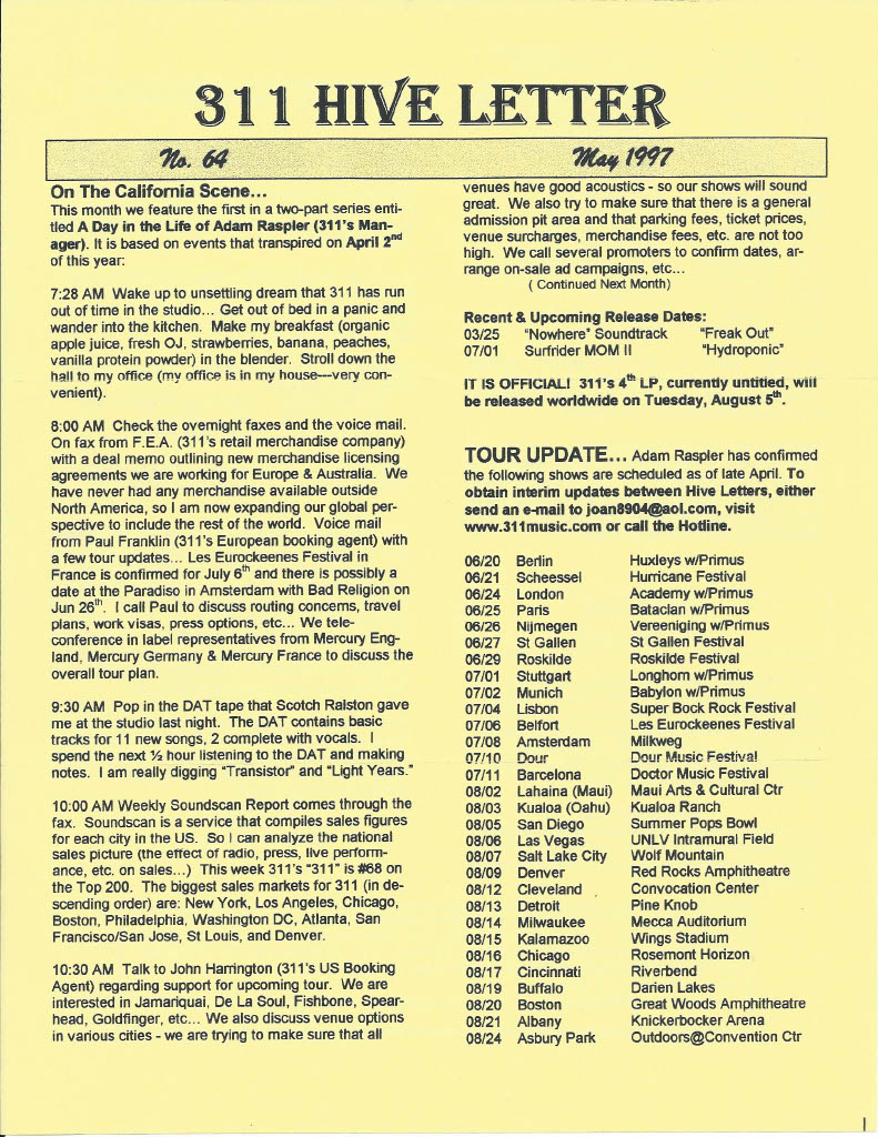 311 Hive newsletter was similar to “In Your Face”. It featured band updates, tour dates, fan messages and photo collages. In 1998, the newsletter combined with the merchendise catalogs. It ran until 1999, as the dawn of the internet-age made sending newsletter updates by email more feasible to the band’s ever-expanding fanbase.
